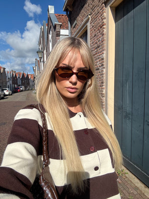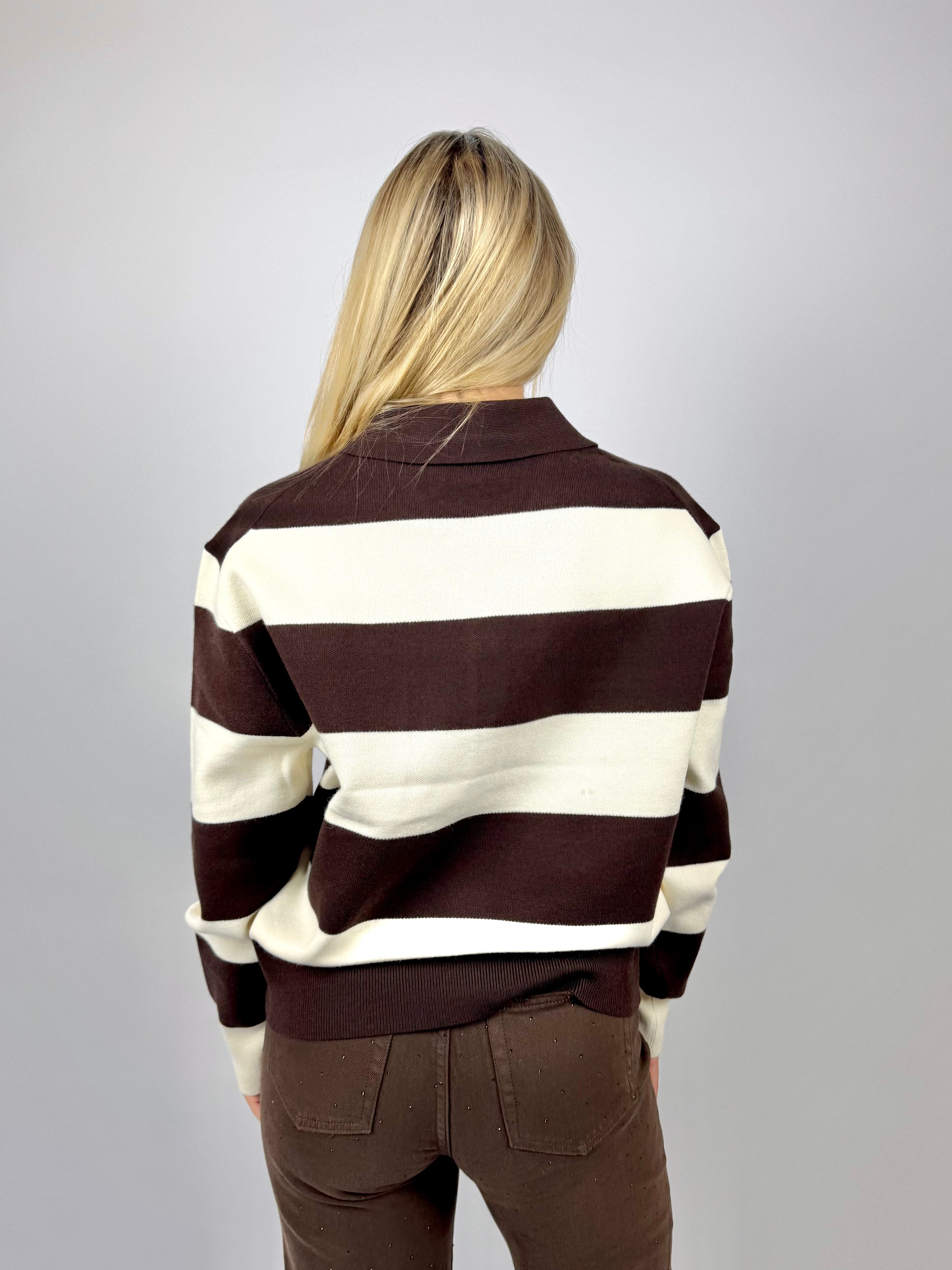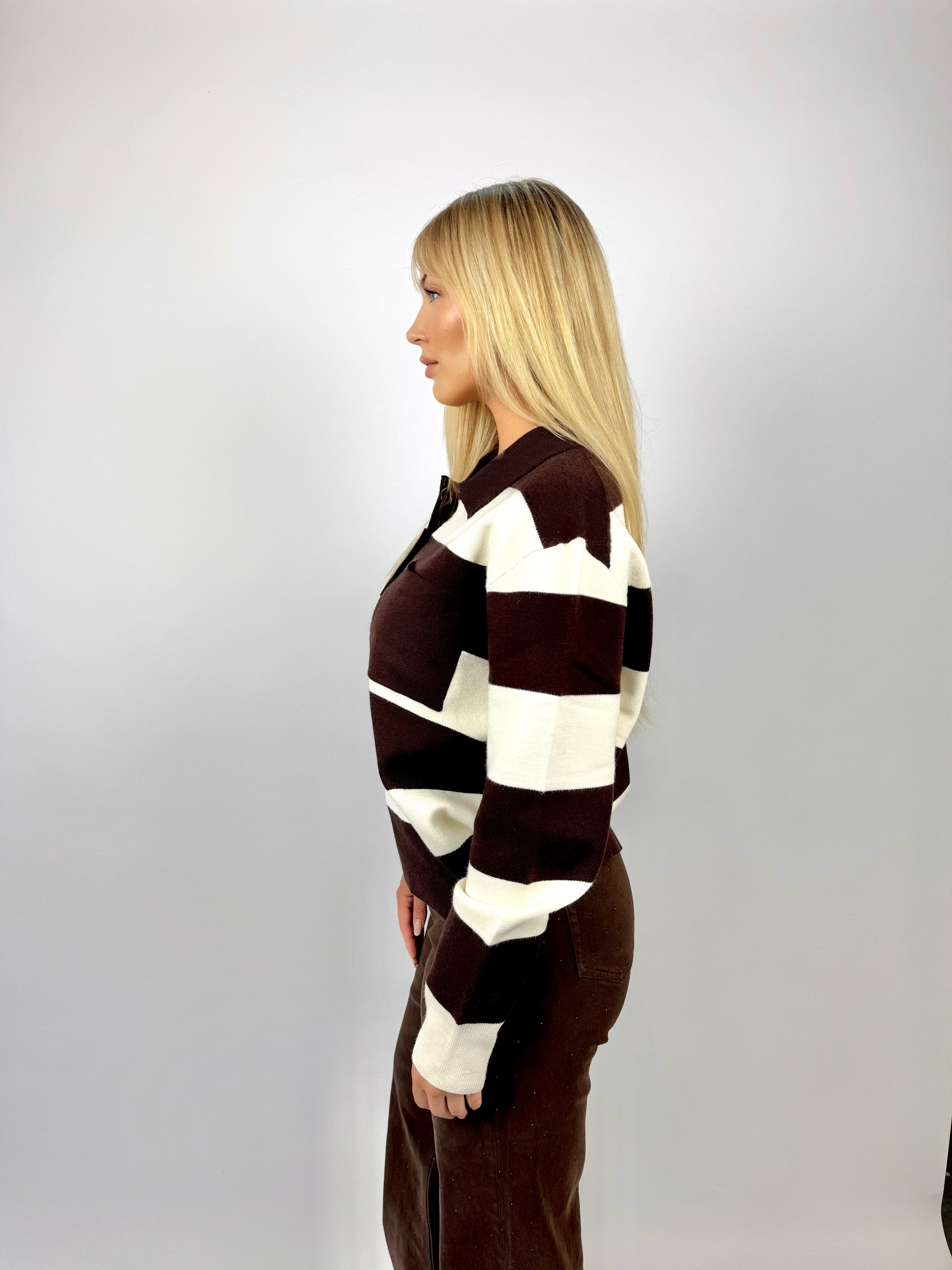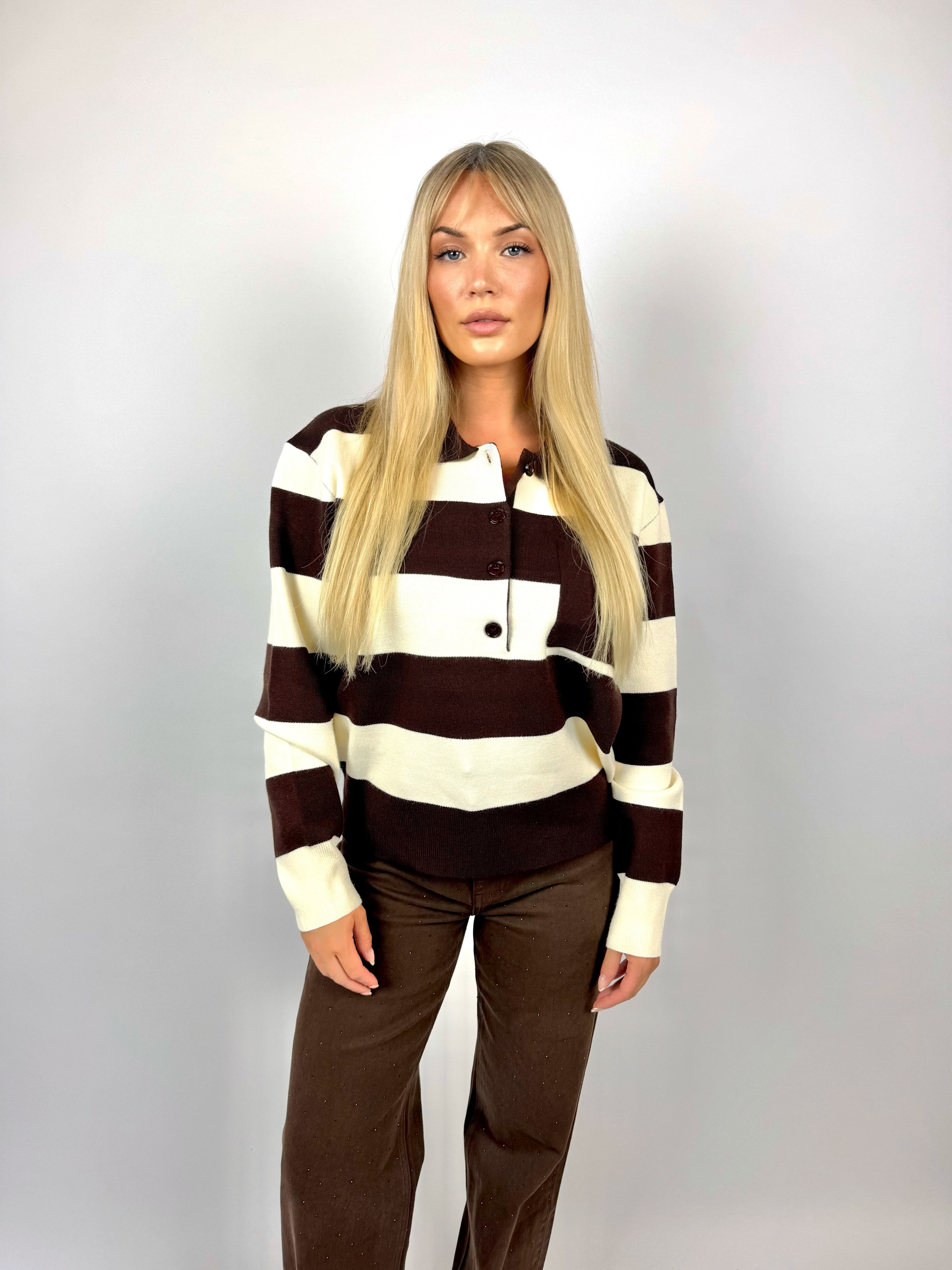 • Details: polokraag, borstzak, bruine knopen