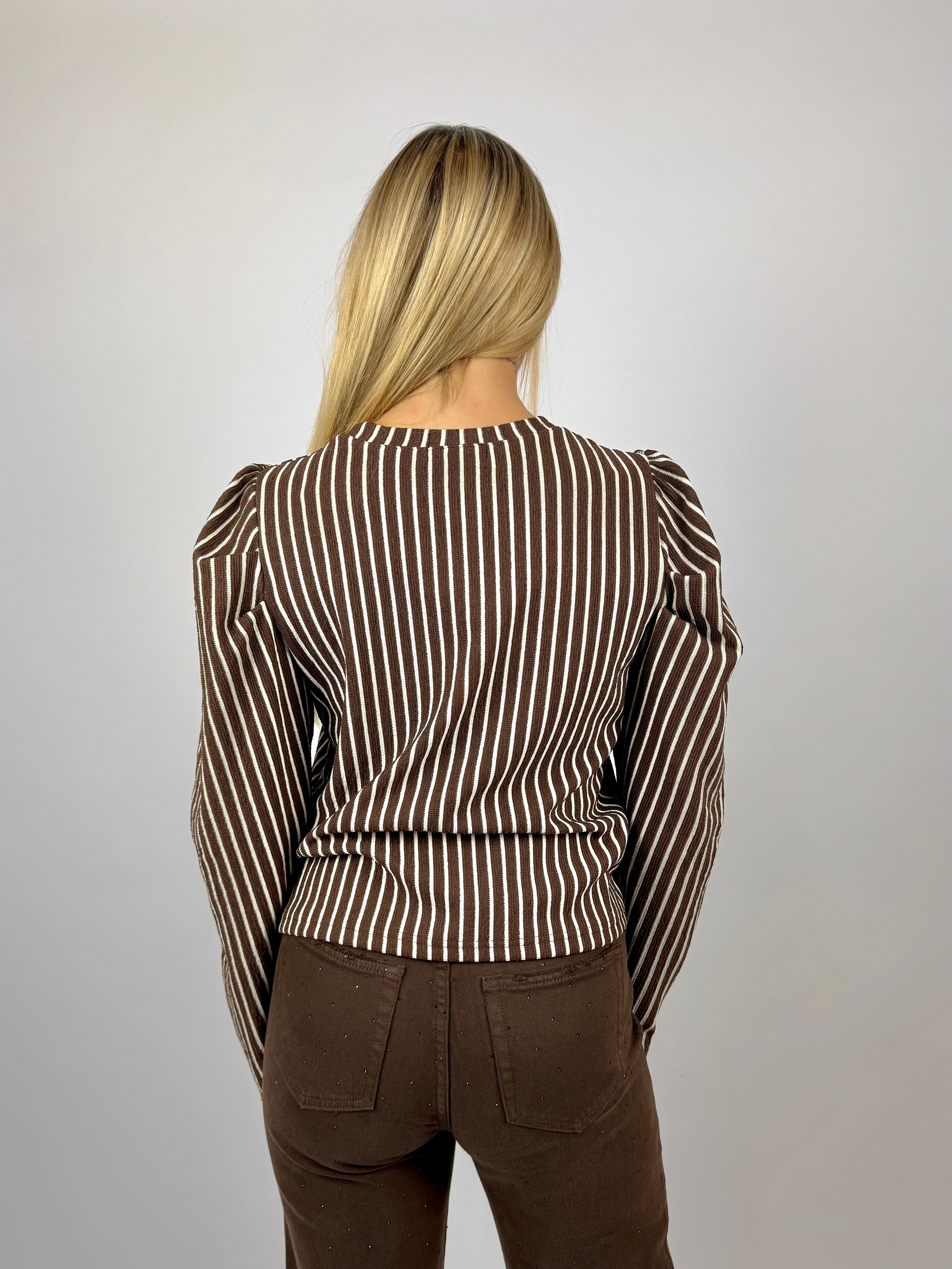 - Details: strepen, stretch, ronde hals, lange mouwen met subtiele pofschouders